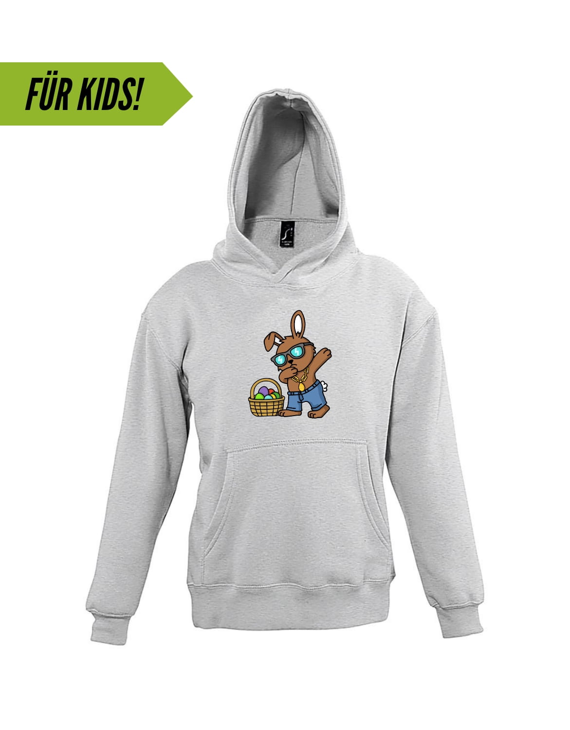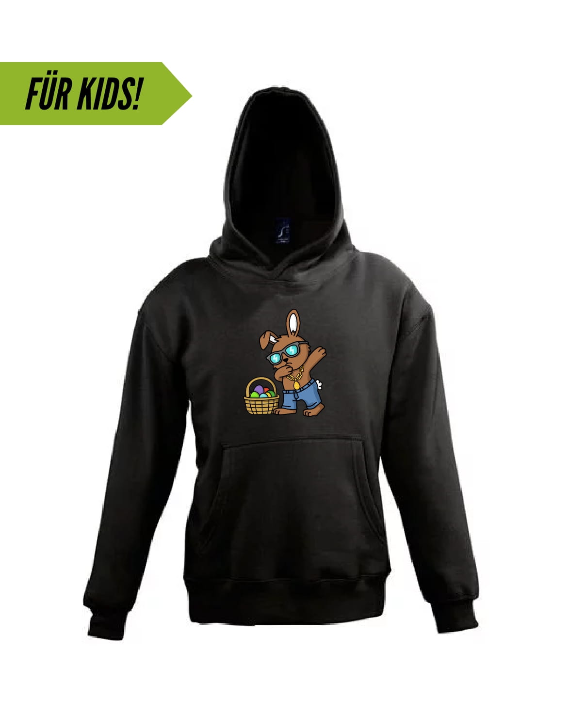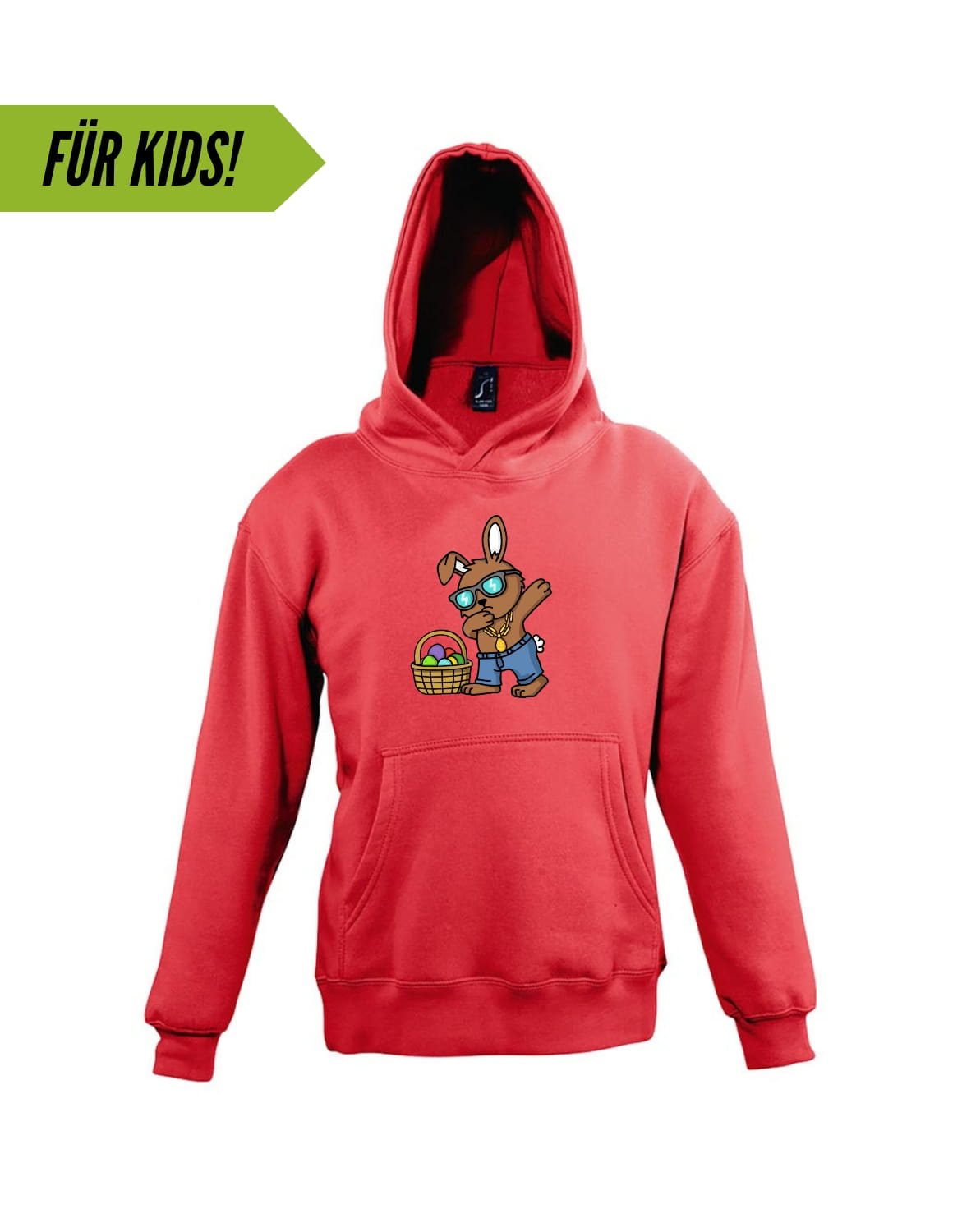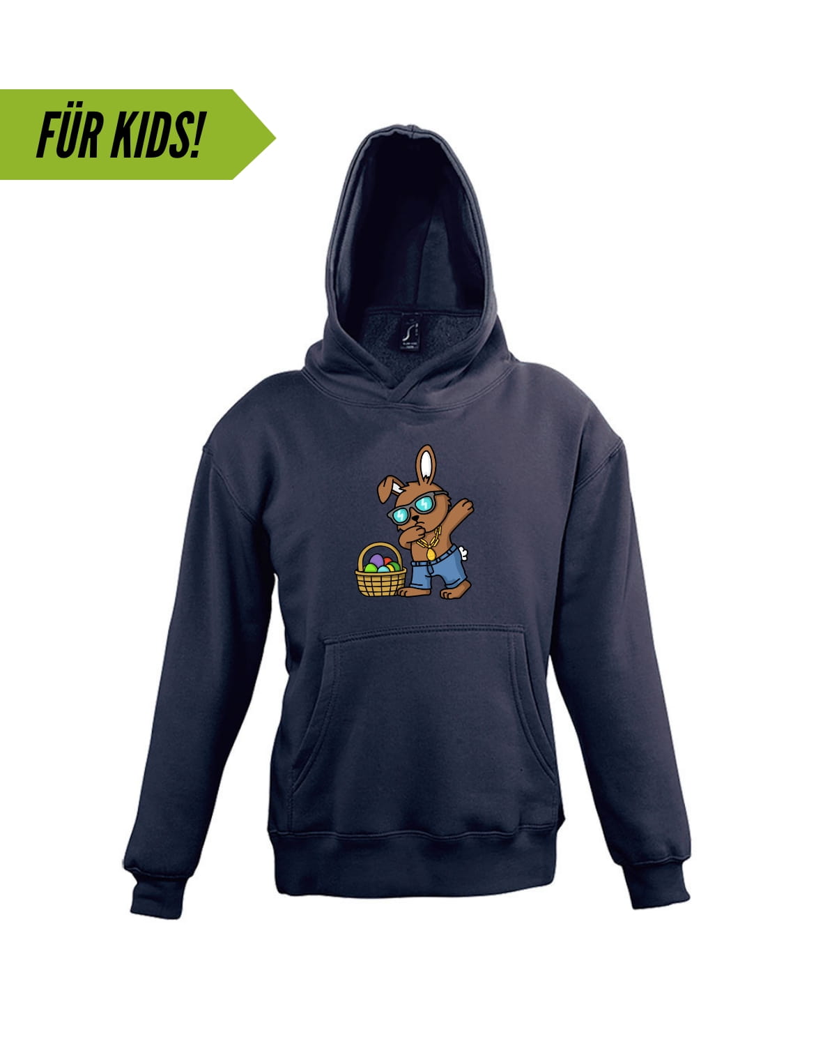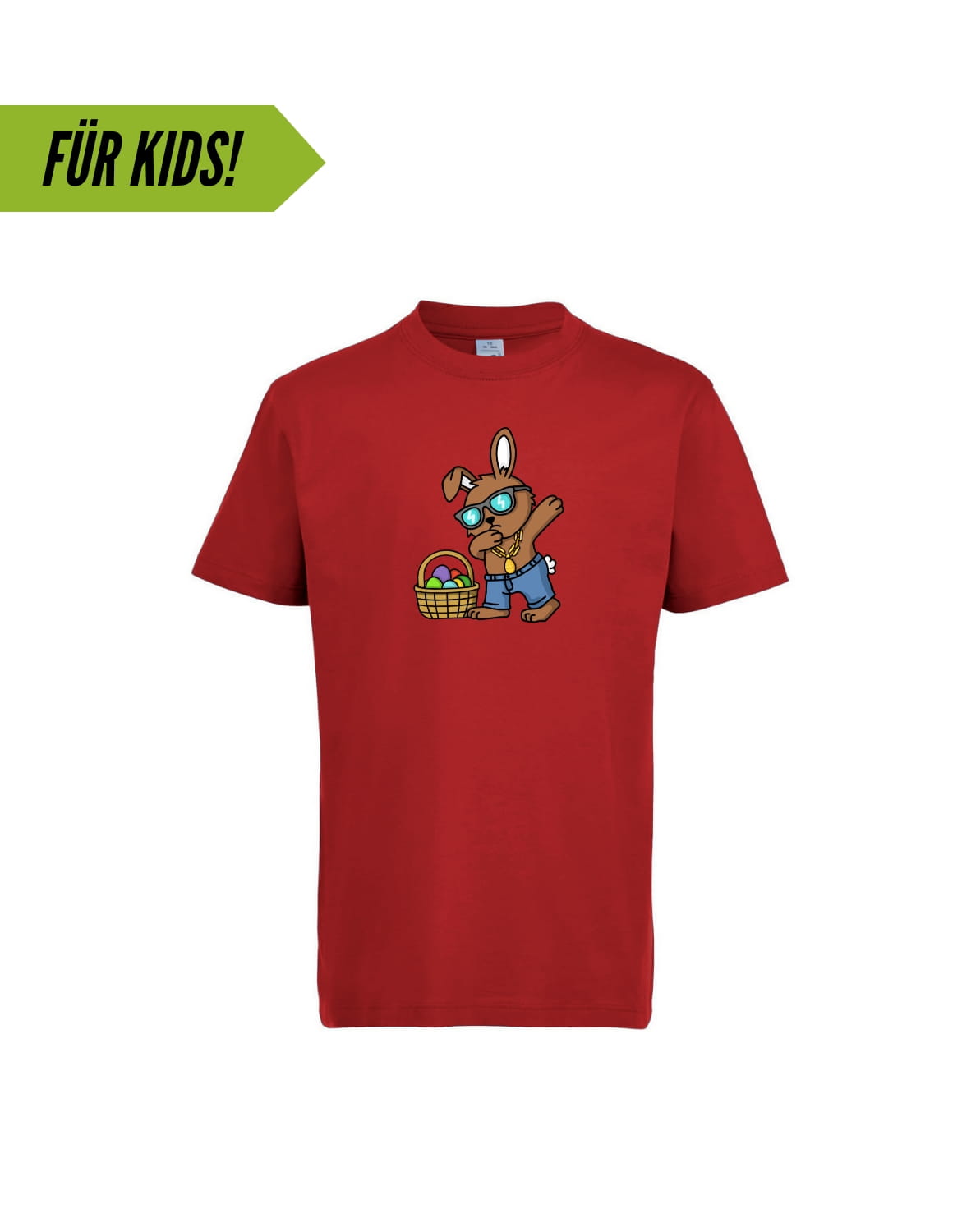 Der Osterhase weiß, wie man cool aussieht! Egal ob drüber oder drunter, mit diesem Motiv ist Dein Mini-me immer gut gekleidet.